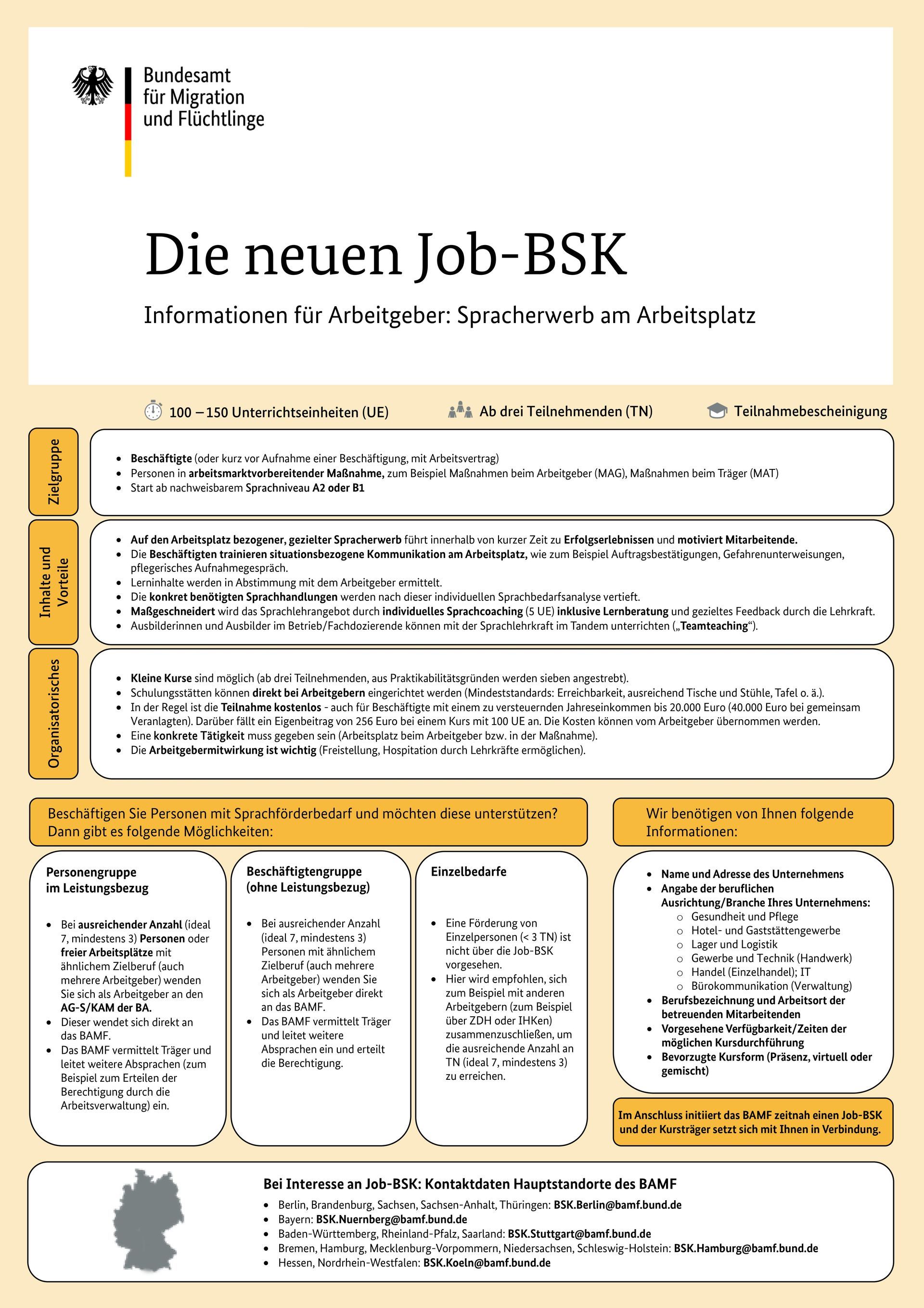 Noch mehr Informationen zum Thema „Job-BSK“ (BSK steht für berufsbezogene Sprachkompetenz) finden sich auch auf der Seite https://www.bamf.de/DE/Themen/Integration/ZugewanderteTeilnehmende/JobBSK/job-bsk-node.html